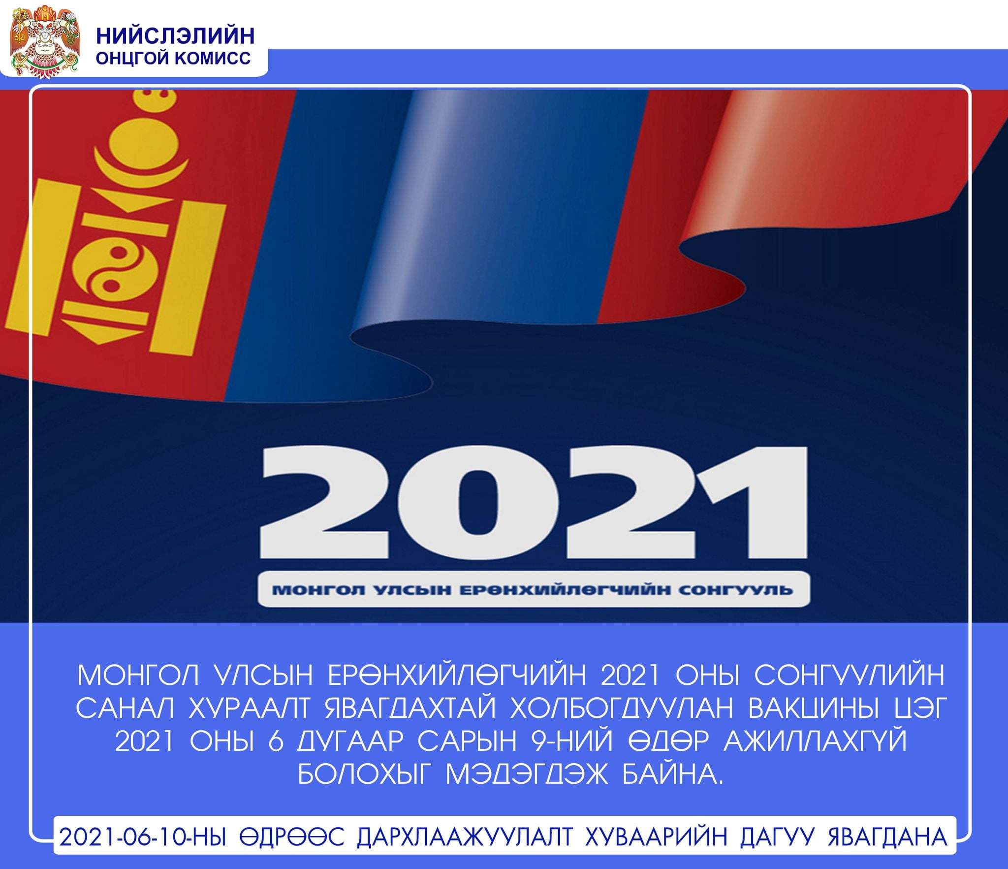 Монгол Улсын Ерөнхийлөгчийн ээлжит сонгуулийн санал хураалт маргааш болно. Иймд маргааш дархлаажуулалтын цэг ажиллахгүй.