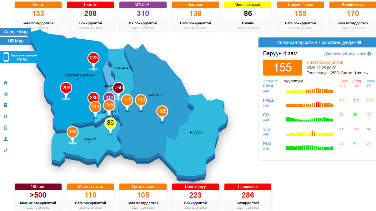 Өнөөдөр өглөөний 08 цагийн байдлаар 100 айл орчимд агаар маш их бохирдолтой байна. Мөн МҮОНРТ, Баянхошуу орчим агаар их бохирдолтой, Толгойт бохирдолтой, Амгалан, Баруун дөрвөн зам, Бөхийн өргөө, 1-р хороолол орчим бага бохирдолтой байгаа үзүүлэлтийг зааж байна.